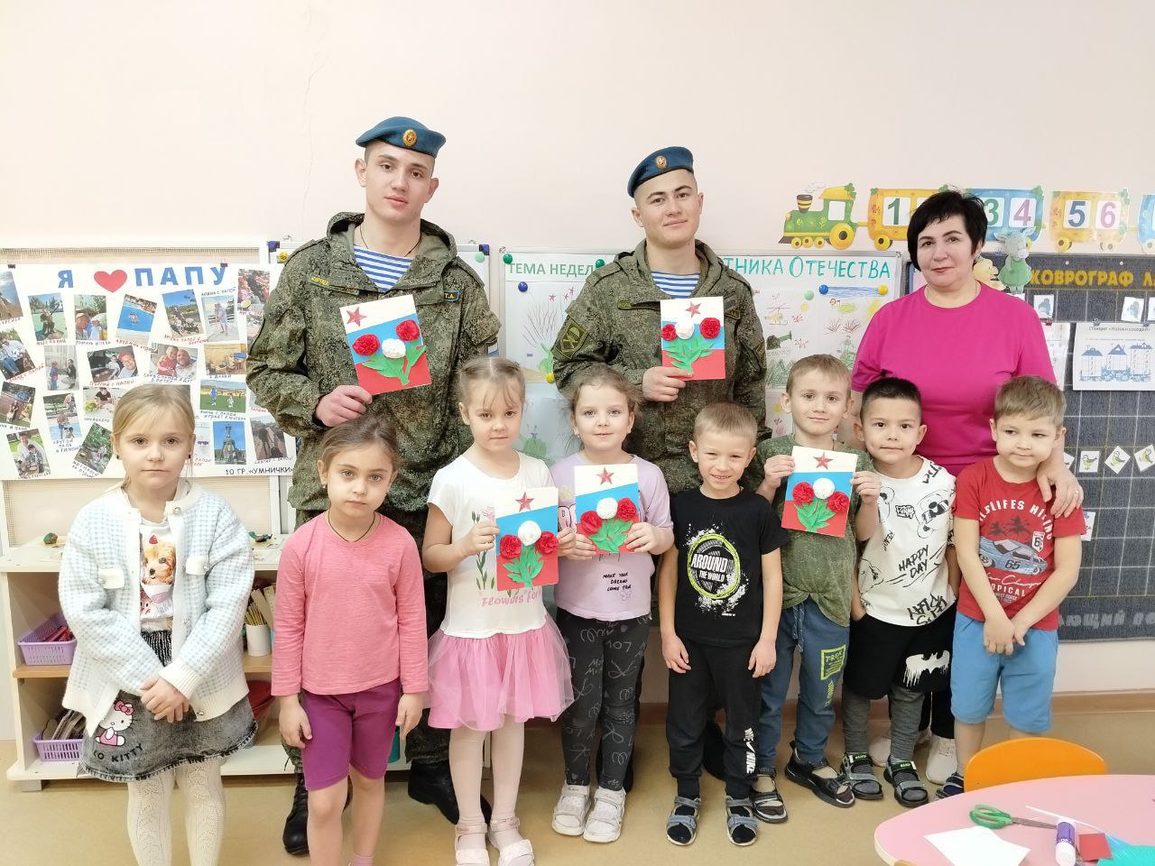 В детском саду № 20 «Жемчужинка» почетными гостями патриотического мероприятия стали военнослужащие. Ребята поздравили защитников нашей Родины стихами, вручили подарки и открытки.