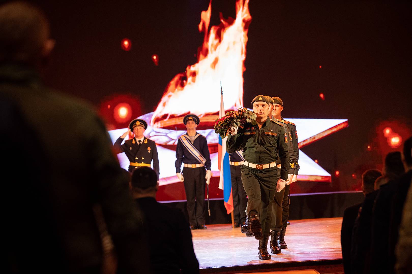 В память о погибших защитниках Отечества всех времен объявили минуту молчания, к Вечному огню направили почетный воинский эскорт для возложения Гирлянды славы.