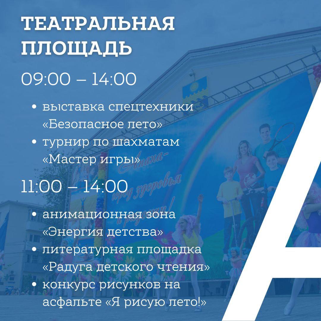 В течение 1 июня цикл ярких событий пройдет на Театральной площади, Арт-авеню, сцене-«ракушке» на ул. Горького, в парке «Ореховая роща». Дарить детям праздник будут артисты и творческие коллективы учреждений культуры, библиотекари, активисты Арт-сообщества и молодежных организаций