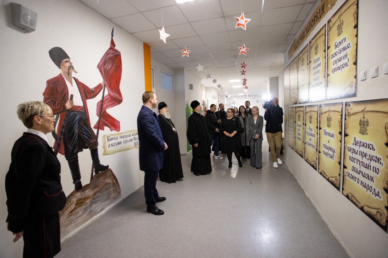 Также участники делегации оценили систему школьной безопасности – турникет с распознаванием лиц, интеллектуальную систему видеонаблюдения, посетили кванториум, вегетарий и различные профильные кабинеты, где с удовольствием пообщались с учениками и дали напутствие юным казачатам. Представители Кубанской митрополии предложили развернуть в школе краевую экспозицию, которая включает порядка 30 метров информационных стендов об основах веры казаков и казачьих традициях. Экскурсии для знакомства с ней организуют для ребят из всех казачьих образовательных организаций города-курорта.