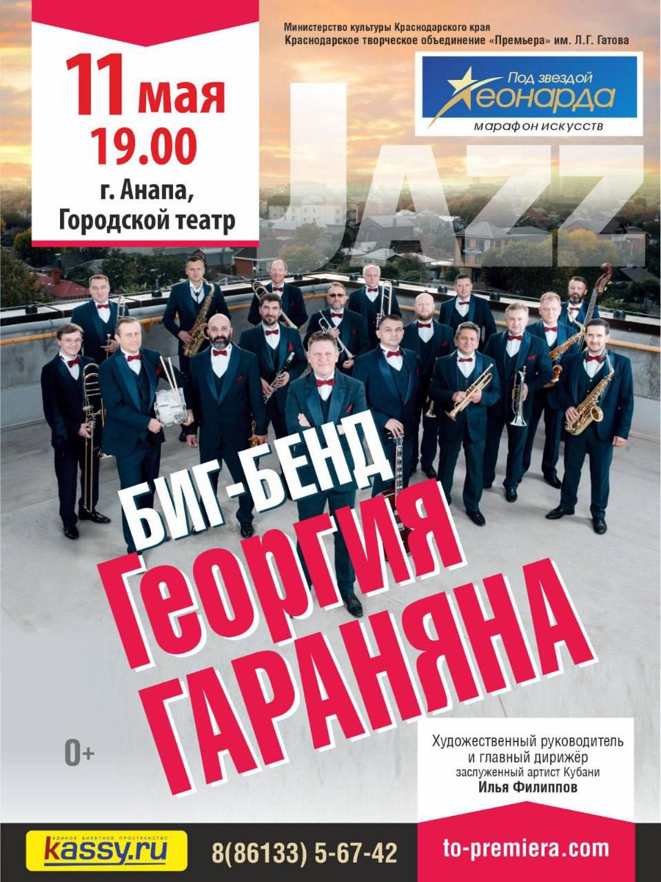 В рамках фестиваля 11 мая в 19:00 в Анапе с концертной программой выступит прославленный Биг-Бенд Георгия Гараняна, который в этом году отмечает своё 25-летие. Подробности – в кассах Городского театра.