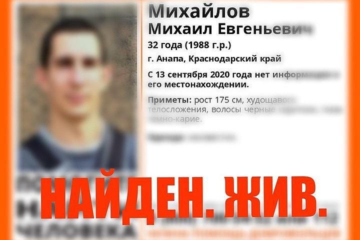 Стало известно о том, что завершены поиски 32-летнего Михаила Михайлова, пропавшего неделю назад в Анапе. Напомним, об исчезновении мужчины сообщили в поисковом отряде «Лиза Алерт». Он перестал выходить на связь с 13 сентября 2020 года. Родные встревожились и обратились за помощью к поисковикам в надежде, что они помогут найти Михаила.